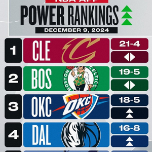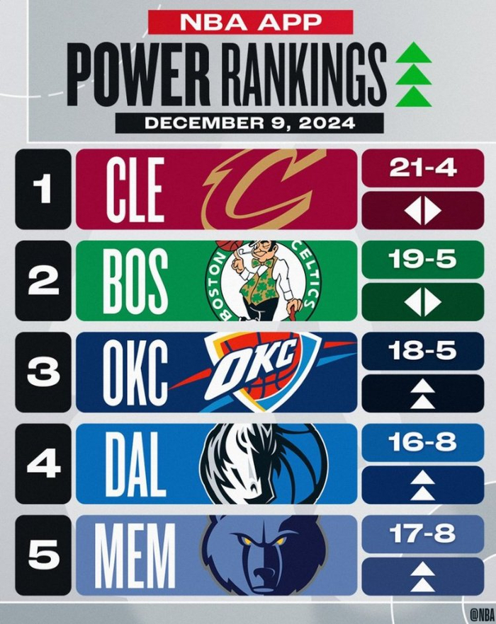 直播吧12月10日讯 NBA官方公布了最新一期实力榜,其中骑士、绿军稳居前2,灰熊近10战9胜跻身前5。
