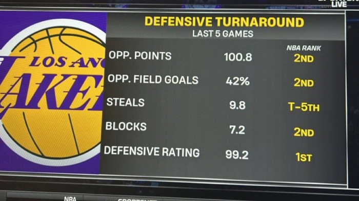 据统计,在最近的5场比赛中湖人防守表现亮眼,他们4场比赛将对手得分限制在100分及以下,5场平均限制对手得到100.8分,限制对手投篮命中率42%,均为同期联盟第二。