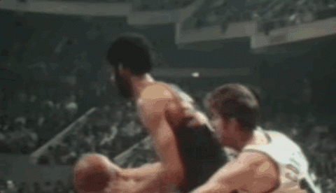 打个不恰当的比喻,一般球员勾手就像跳投里的单动式(one motion)投篮,在下肢发力的瞬间,一气呵成,把球投出。而贾巴尔的天勾更像双动式(two motion)投篮,下肢发力起跳,在最高点再用上肢发力,把球投进篮筐。换句话说,天勾就是勾手里的干拔。