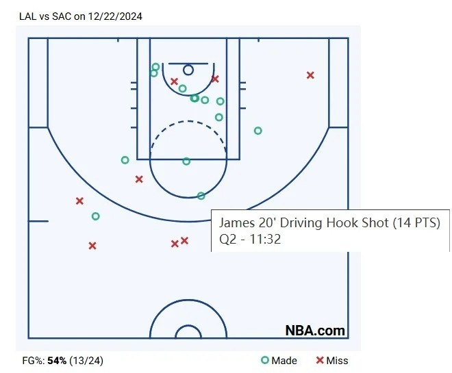 詹姆斯本赛季一共进了3个勾手,这是最近的一次