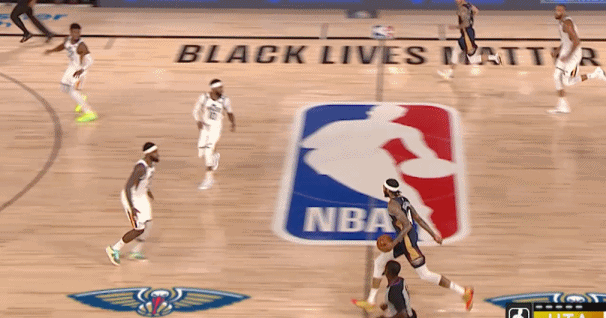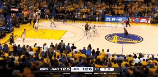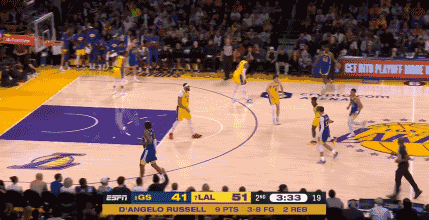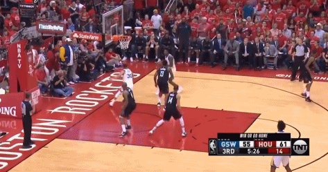 第二部分才是他为库里做的掩护:建立好自己的位置了,那么就开始给库里做掩护,按照规则,追梦可以在被掩护人的行动路径上移动。