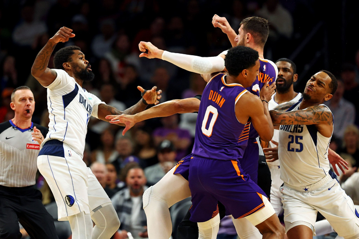 直播吧12月29日讯 在昨日太阳在主场以89-98不敌独行侠的比赛中,太阳队努尔基奇与独行侠队PJ-华盛顿和马绍尔发生冲突,三人均被驱逐。