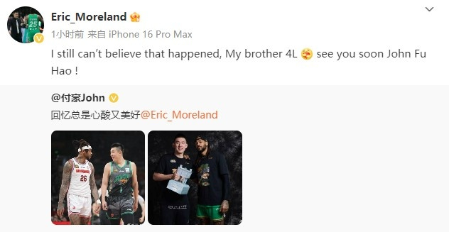 莫兰德回复了前队友此前的致敬微博,并写道:“我至今仍不敢相信(离队的)发生。我一辈子的兄弟,下次再见了,大付!”