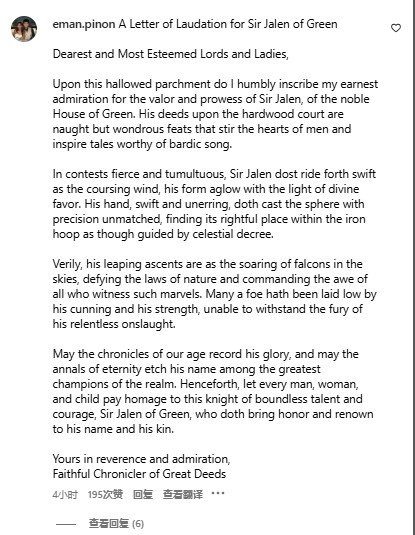 愿我辈时代的史册铭记他的辉煌,愿永恒的年鉴中镌刻他的名字,与这片疆域最伟大的英豪比肩。从今往后,愿每位男士、女士与孩童都向这位才华与勇气无边的骑士——杰伦爵士致敬,他为自己的名号与家族赢得了无上的荣耀与声誉。
