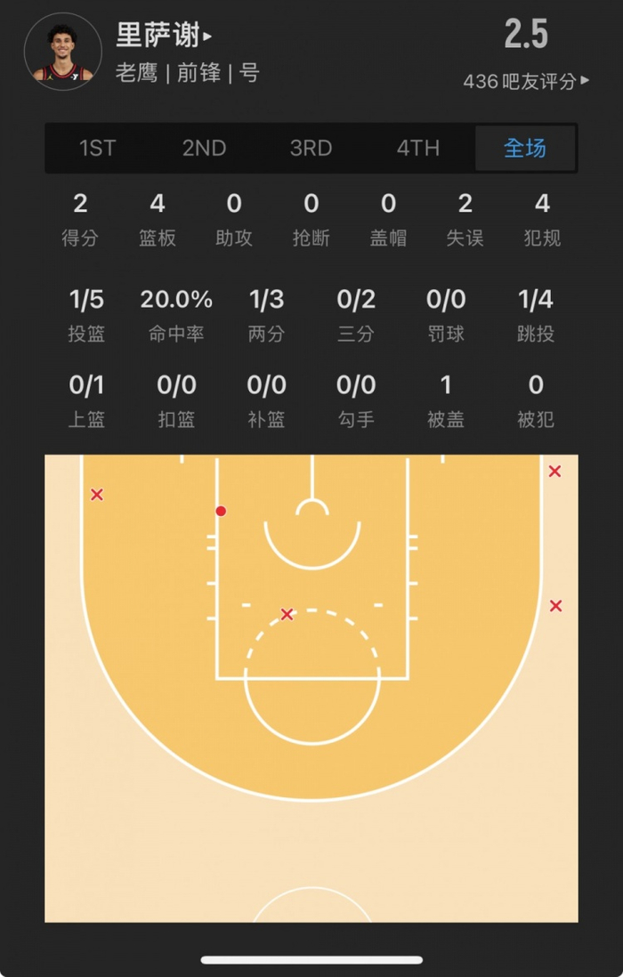 老鹰状元秀 扎卡里-里萨谢 登场17.3分钟