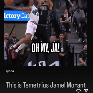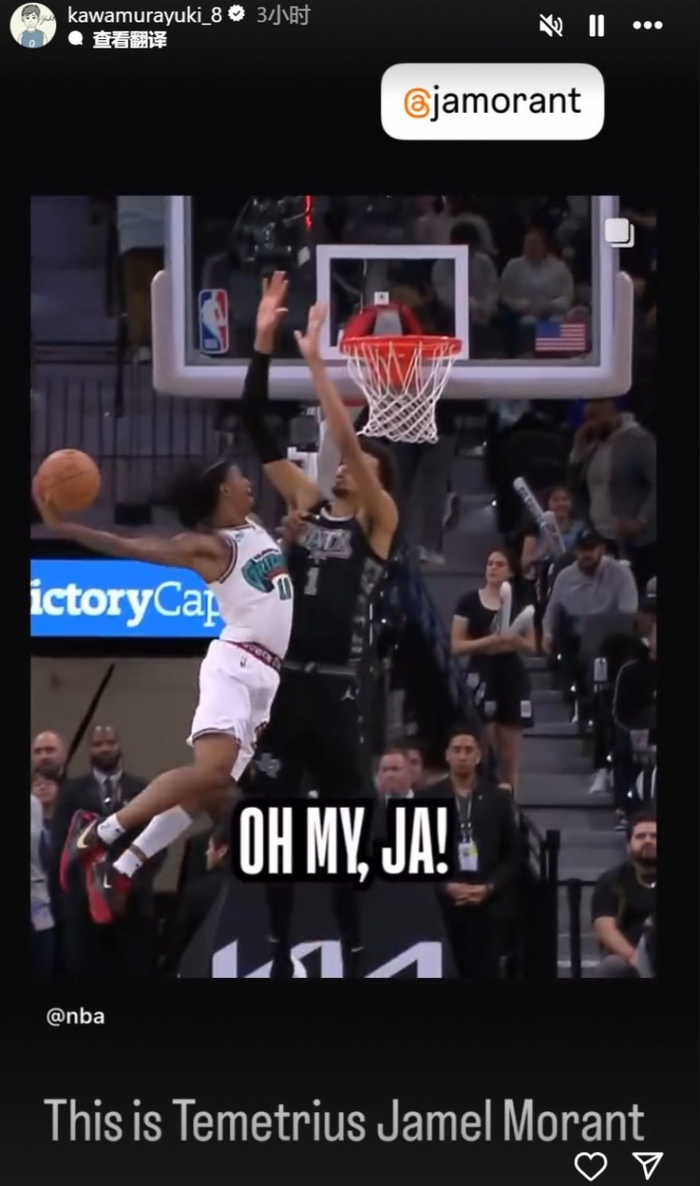 在今天的比赛中,莫兰特面对文班亚马上演了一记历史级别的隔扣,可惜提前被吹犯规。
