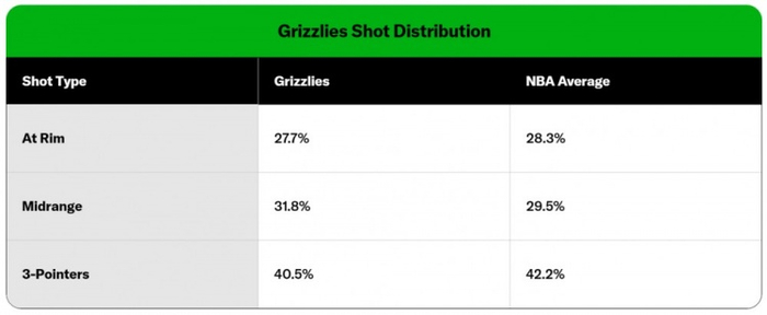 (灰熊篮下出手占比27.7%,联盟平均28.3%;中距离出手占比31.8%,联盟平均29.5%;三分出手占比40.5%,联盟平均42.2%)