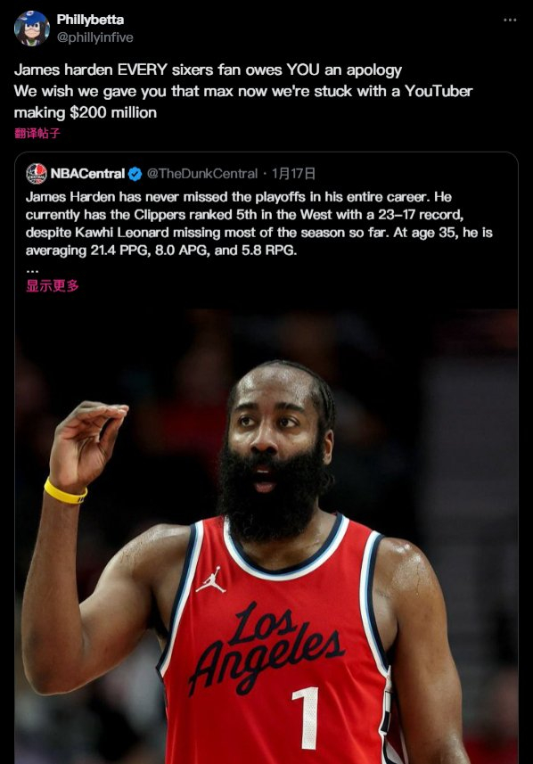 费城自媒体Phillybetta转发了这则推特并写道:“登哥,每一位76人球迷都欠你一个道歉,多希望我们之前能给你顶薪,但现在我们被一个赚2亿美元的油管博主困住了。”