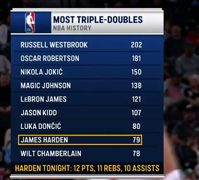 这是哈登本赛季第2个三双,生涯第79个三双,超越张伯伦独占历史第8,距离东契奇仅差1个。