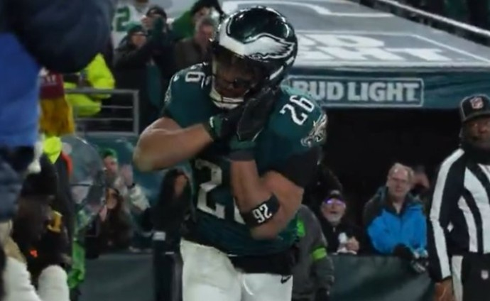 费城老鹰明星跑卫萨克万-巴克利在完成达阵后做出库里标志性“晚安安”庆祝动作,并绕场庆祝😝!