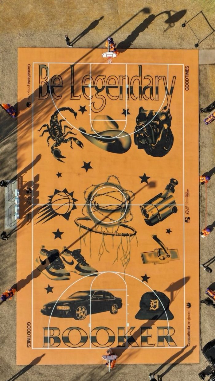 该球场上面写道:“布克,成为传奇(Be Lengendary)。”场上元素还包括布克的签名球鞋、他的爱车和宠物狗。