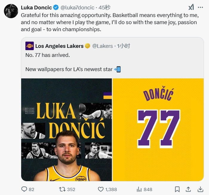 东契奇转发湖人77号球衣照,并写道:“非常感谢这次令人惊叹的机会,篮球对我而言意味着一切,无论我在哪里打球,我都会带着同样的快乐、激情和目标——赢得总冠军!”