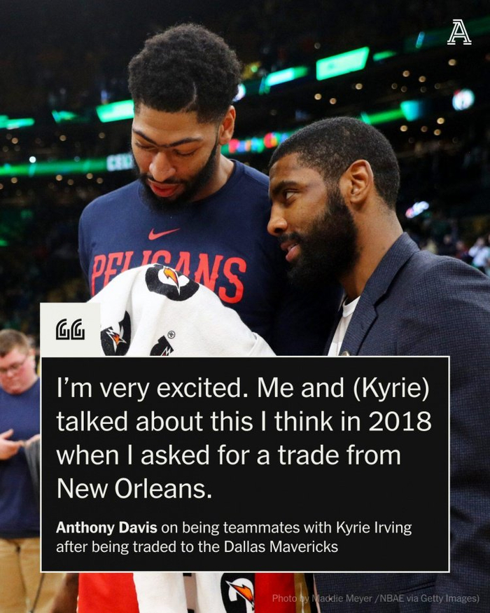 谈到和欧文搭档,浓眉说道:“我感觉很兴奋。我2018年在鹈鹕申请交易的时候就和欧文谈论过这件事。我们一直想一起打球。现在我们有机会这样做了。”