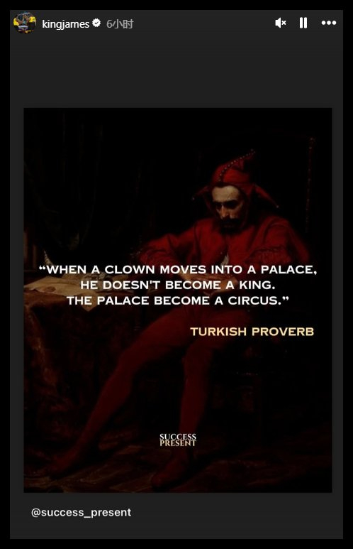 詹姆斯转发鸡汤:小丑进皇宫不会变国王👑 皇宫反而会变马戏团