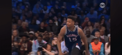 康诺顿跃过字母哥,双手打板后折叠扣篮。