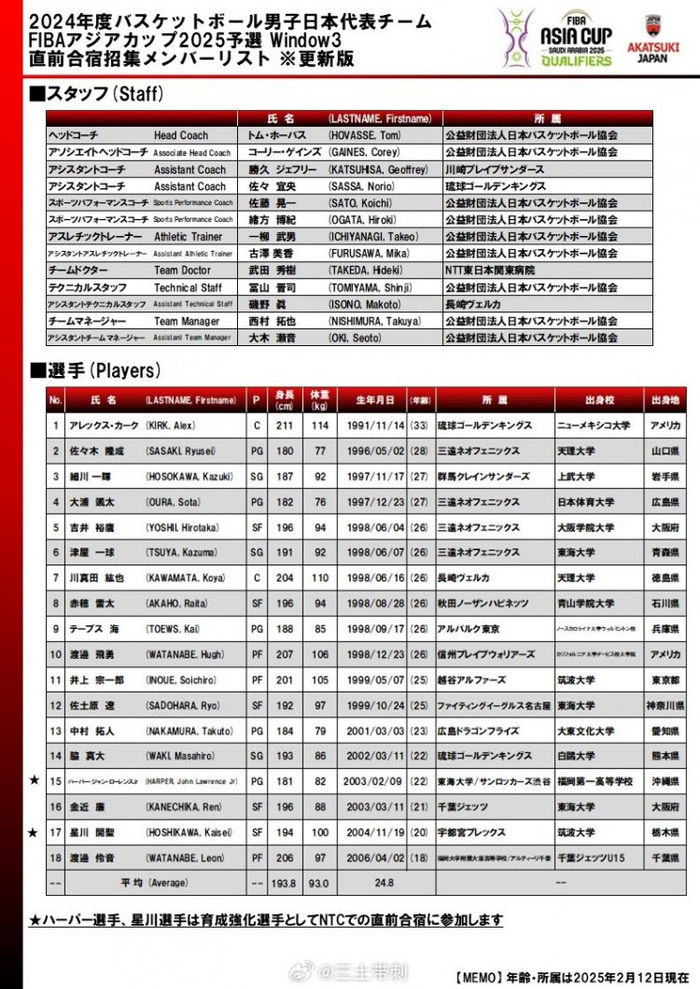 直播吧2月18日讯 今天吗,媒体人@三土带刺报道了日本男篮的动态。