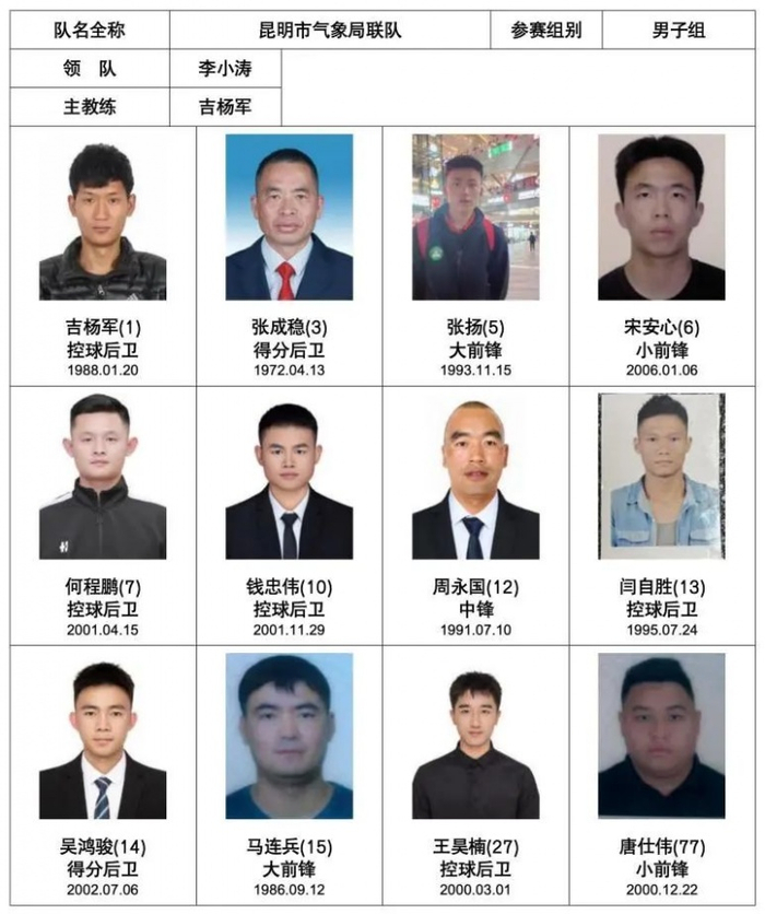 昆明市气象局联队成立于2004年,主要由昆明市气象局联合各大企事业单位篮球爱好者组成。球队注重团队合作和个人技术的提高,定期组织训练,始终秉承“快乐篮球、青春永驻”的宗旨进行锻炼及比赛。球队敢于挑战、勇于创新,无论面对何种困难,都能够紧密协作、克服困难、奋力拼搏,技术风格上灵活多变。通过积极的参加训练和比赛,享受篮球带来的快乐。