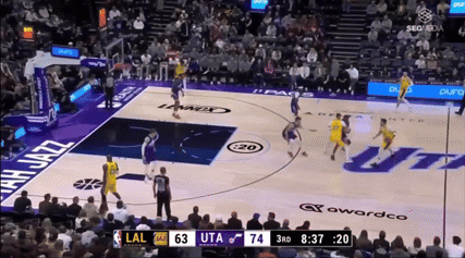 在前两场比赛中,东契奇大部分进攻都源自于和海斯、里夫斯的挡拆,分别针对凯斯勒和克拉克森。同样,为了能对付爵士,湖人也让东契奇在弱侧进行突破,让海斯给他设掩护,为东契奇创造出低位得分的机会,以及给东契奇后撤步三分创造出空间,或者找到吊球给海斯的传球路线。