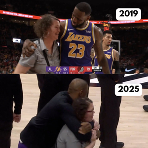 直播吧02月21日讯 NBA常规赛,湖人110-102击败开拓者,赛前詹姆斯突然跑去拥抱一位开拓者女服务员。
