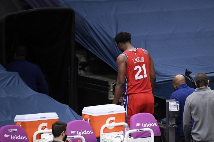 周六比赛的第四节,恩比德冰敷了他的膝盖,这个膝盖在去年冬天因对手压在上面而受伤,之后进行了修复。周六第三节,恩比德膝盖的伤势看起来似乎又加重了。