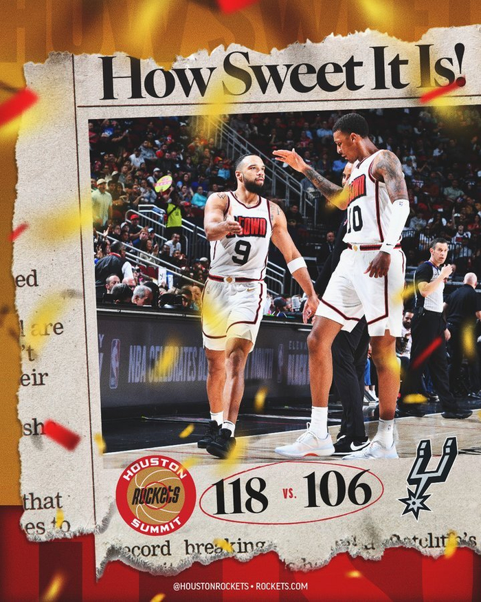 赛后火箭官方晒出赢球海报,狄龙和小贾巴里-史密斯登上封面。