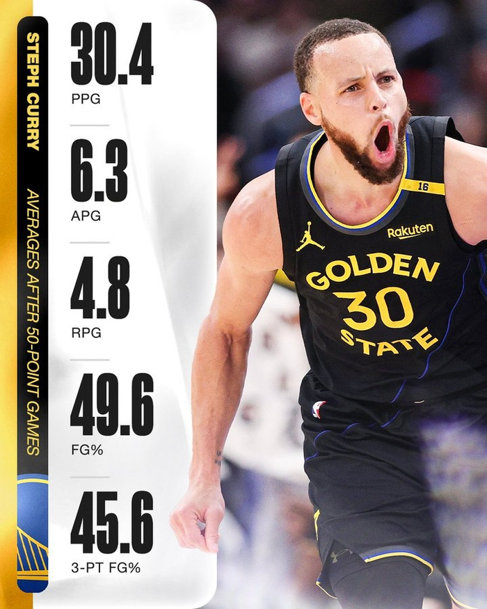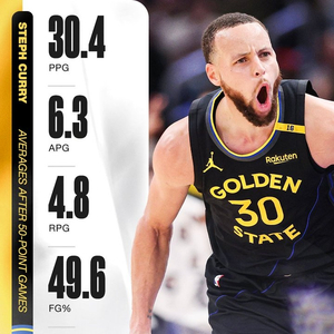 美媒SportsCenter晒出数据,在库里砍下50分之后的接下来一场比赛中(生涯共13场),他场均可以拿到30.4分6.3助攻4.8篮板,投篮命中率49.6%,三分命中率45.6%。