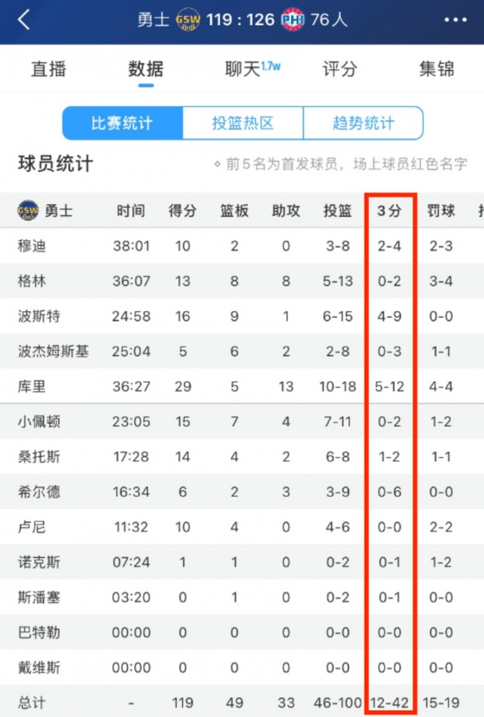 本场比赛,勇士外线除了库里和波斯特,其他人投得一塌糊涂,射手们皆手感不在线。全队外线共42中12,其中库里(12中5)和波斯特(9中4)合计21中9,队友们合计21中3...