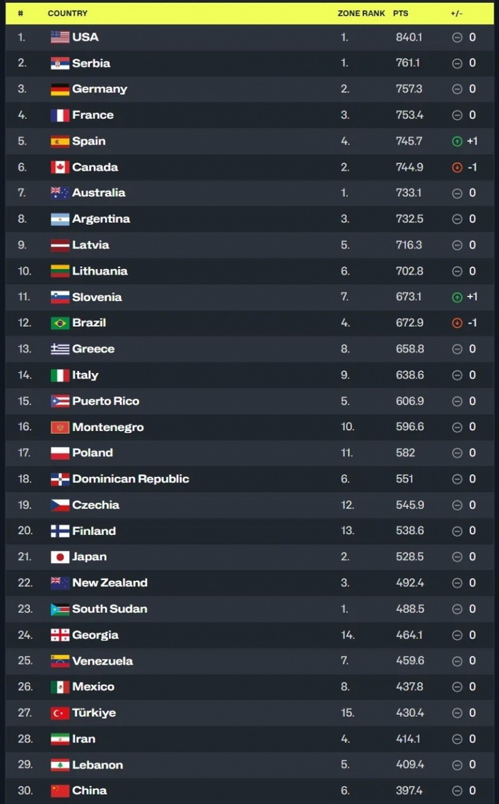 要说赢家的话,当属2018年欧洲杯中表现出色的斯洛文尼亚、意大利、拉脱维亚等多支球队了。新榜单开始正视欧洲篮球整体水平在世界篮坛的领先地位,前30名中光是来自欧洲的就有18家,比起旧版这无疑更符合主流的观点印象。