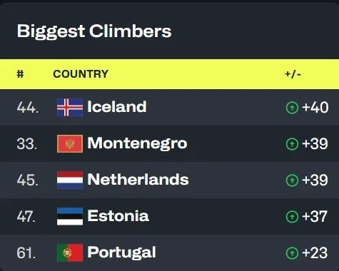 2023年9月,克罗地亚再掉五个名次,排名正式落到中国身后,他们在那个被新纳入统计的窗口期合计输给瑞典荷兰乌克兰55分,令人无语。