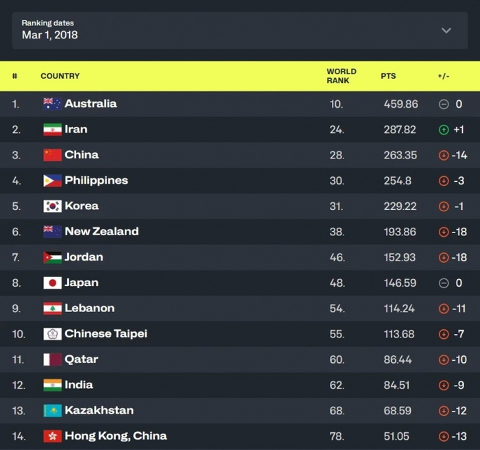 这里可以看到,中国队俯冲掉了14名,同样俯冲的还有非洲区第一第二尼日利亚和安哥拉,以及大洋洲千年老二新西兰