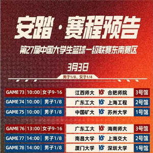 今日将迎来女子1/4比赛与男子1/8比赛。男篮方面,厦门大学对阵深圳大学,前者是上届比赛的8强,后者是上届比赛的黑马,相信这场比赛双方都将使出全力。女篮方面,上海体大是否能延续上赛季进入24强的状态也十分值得期待。