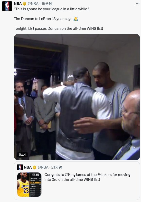 今天胜场数超越邓肯!NBA官推晒经典视频:未来是你的