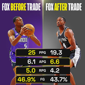 本赛季,福克斯在国王场均25分5篮板6.1助攻,投篮命中率46.9%;在马刺场均19.3分4.2篮板6.6助攻,投篮命中率43.7%。