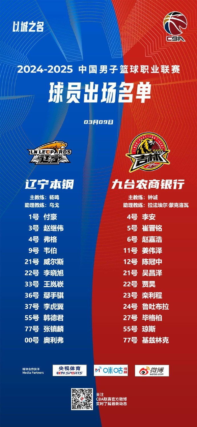 辽宁VS吉林大名单:张镇麟&赵继伟领衔 两队7名外援悉数在列