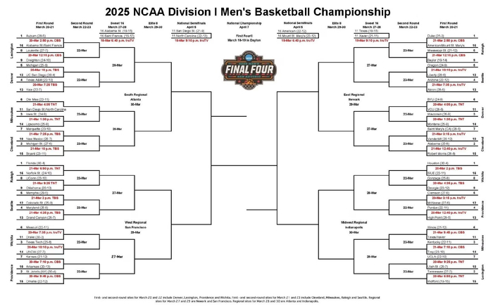 其中四个赛区的头号种子分别是:东区杜克大学、中西区休斯敦大学、南区奥本大学、西区佛罗里达大学。