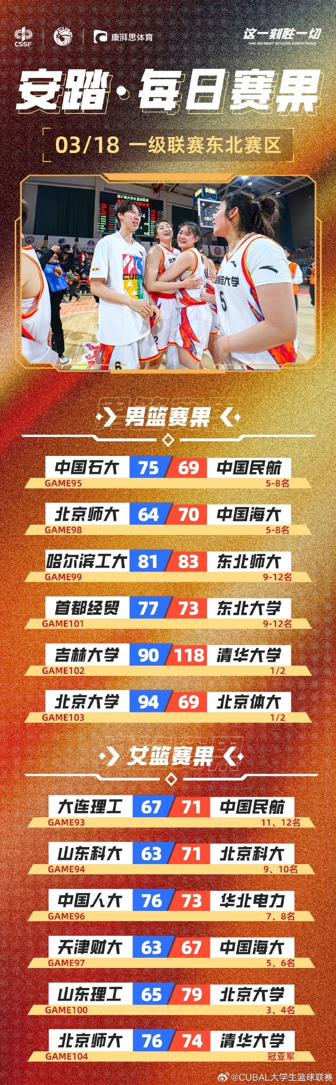 CUBAL今日赛果:北师大女篮双加时险胜清华大学 拿回东北王的宝座