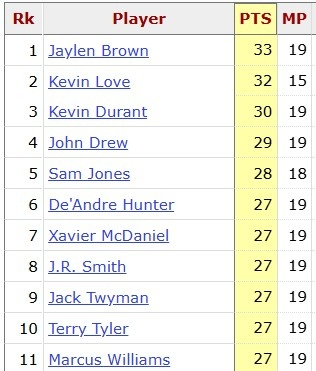 这样一来,马穆凯拉什维利创造了NBA历史出场时间不足20分钟的得分最高纪录,此前纪录为杰伦-布朗的33分。