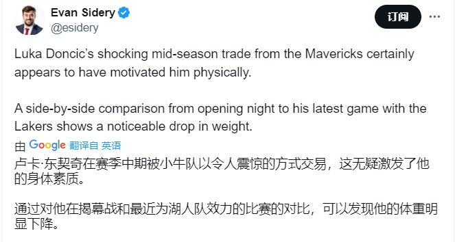 Evan Sidery表示左边是东契奇在揭幕战的照片,右边是湖人时期的照片,可以发现他的体重明显下降。
