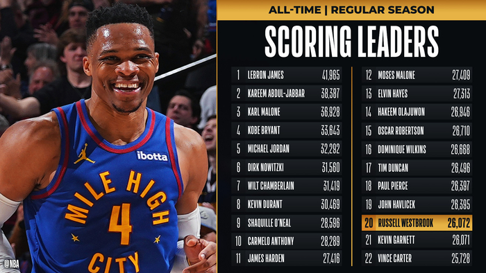 恭喜🤩威少生涯总得分超越加内特 升至NBA历史第20位!