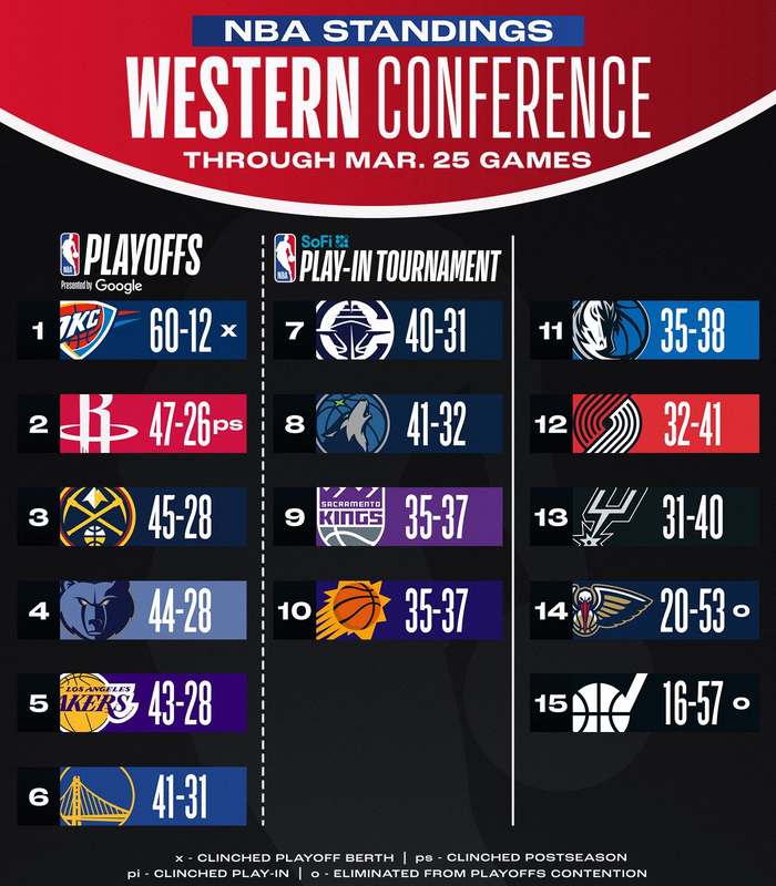 湖人被挤到第五,灰熊升到第四;快船明日有望反超勇士;雷霆豪取60胜!火箭近11战豪取10胜!