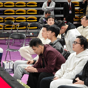 此前眼部受伤的郭艾伦、没有通过体测的丁彦雨航也一同出现了在场边观战。