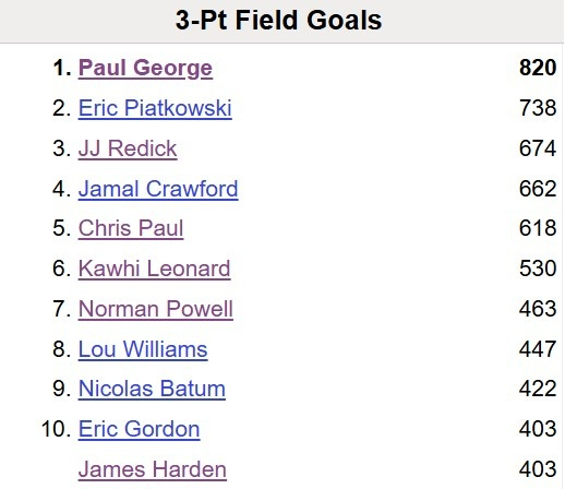 哈登在快船生涯已经投进了404记三分,超越埃里克-戈登,上升至队史第十位。