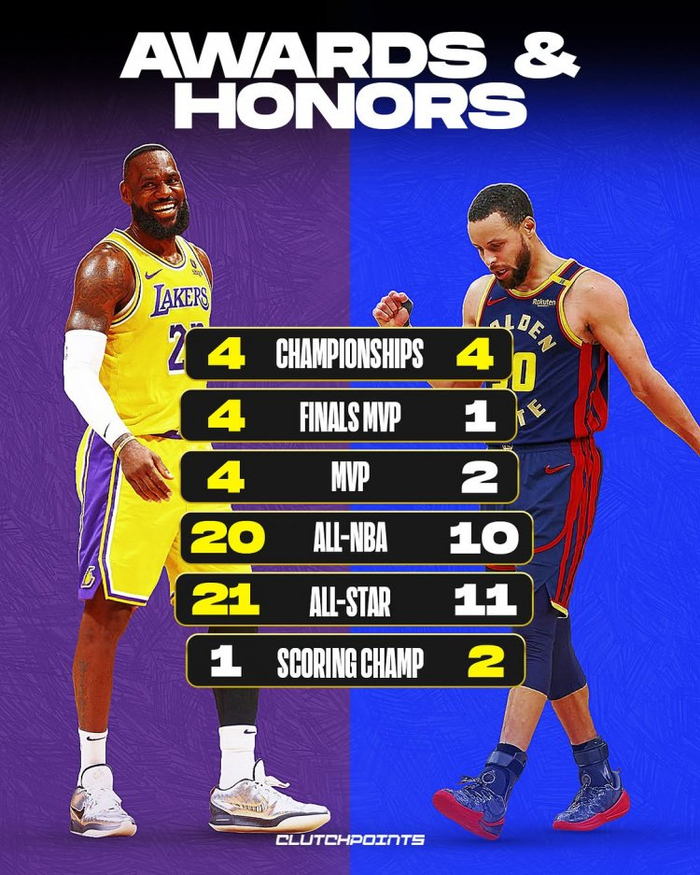 荣誉对比:詹库皆四冠持平 詹姆斯4MVP&FMVP多于库里 库得分王多