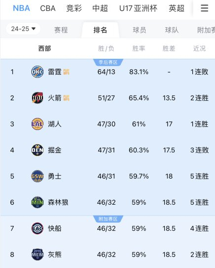 刺激了😉🧯目前西部仅雷火锁季后赛 第3到第8至多差1.5个胜场