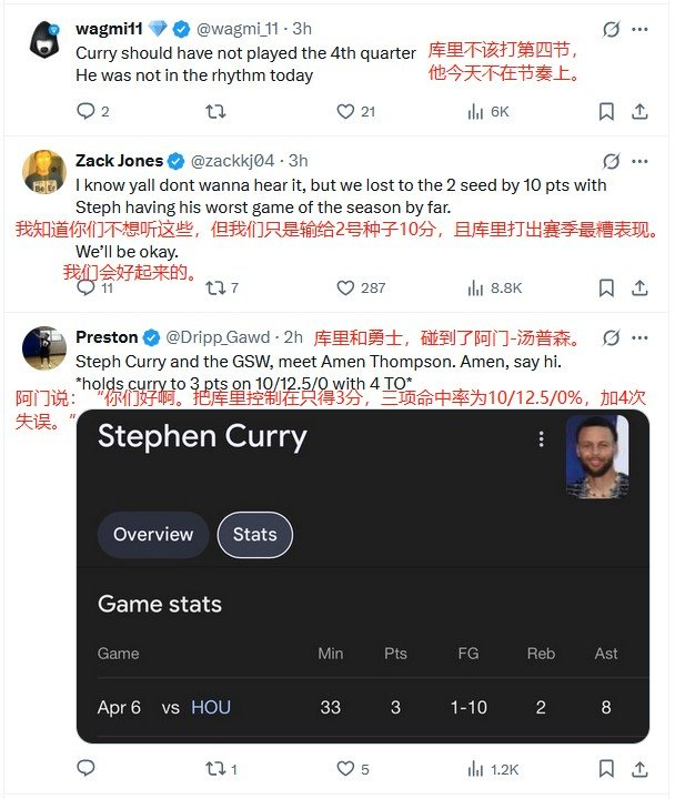 NBA常规赛,勇士96-106不敌火箭。赛后勇士官方晒出本场赛果,勇蜜在下方表达自己的观点,也不乏部分看热闹的火箭球迷。部分热评如下: