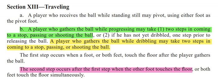 NBA规定,球员在合球之后,可以走两步,走完两步之后可以停下(stop)、可以传球(passing)、可以投篮(shooting)(下图黄色和绿色部分)。