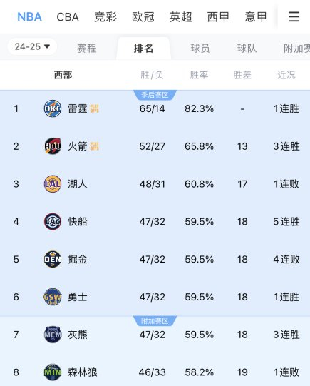 快船、掘金、勇士和灰熊战绩都是47胜32负,根据四队互相交手的战绩,快船、掘金、勇士和灰熊分列西部第4到第7,森林狼排名第8。