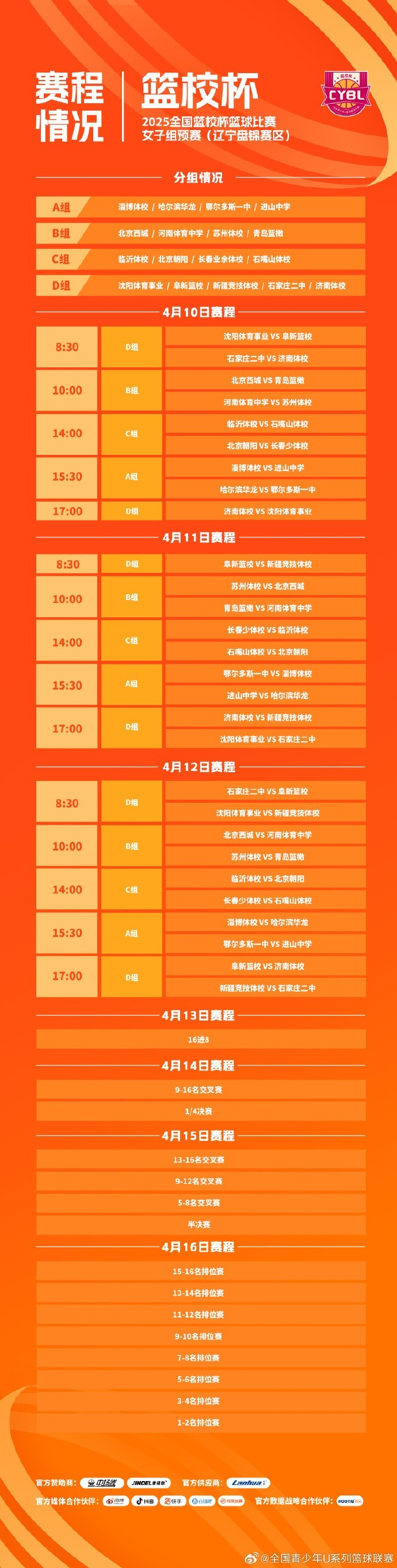 【篮校杯女子组预赛赛程】2025年全国篮校杯篮球比赛女子组预赛将于4月9日-15日分别在江西南昌赛区和辽宁盘锦赛区同时进行。