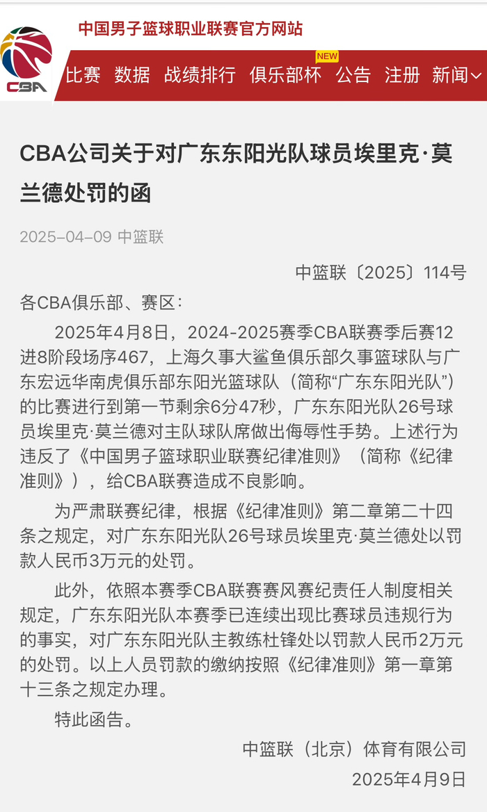 2025年4月8日,2024-2025赛季CBA联赛季后赛12进8阶段场序467,上海久事大鲨鱼俱乐部久事篮球队与广东宏远华南虎俱乐部东阳光篮球队(简称“广东东阳光队”)的比赛进行到第一节剩余6分47秒,广东东阳光队26号球员埃里克·莫兰德对主队球队席做出侮辱性手势。上述行为违反了《中国男子篮球职业联赛纪律准则》(简称《纪律准则》),给CBA联赛造成不良影响。