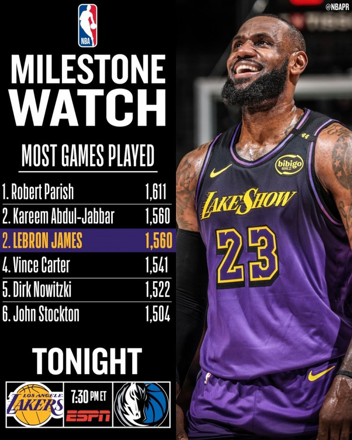 👑詹姆斯今日将出战独行侠 常规赛出场1561次独占历史第二!